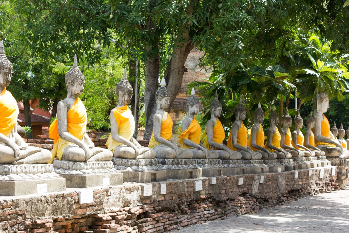 Khun Add, onze chauffeur, brengt ons naar Wat Yai Chai Mongkhon. Gezien de drukte hier, is dit vast het startpunt voor vele bezoekers. Deze tempel wordt omschreven als ‘levendig en relaxed’. De blikvanger hier is de zeven meter lange, liggende Boeddha. Als het je lukt om een muntje vast te plakken aan de voeten van de Boeddha, zal dit je veel geluk brengen. Een gemiste kans? We wandelen verder over het enorme complex en zien vele Thai bidden, compleet met wierook, lotusbloemen en rammelende stokken in de hoop op een gunstige horoscoop. Monniken lopen af en aan in hun oranje gewaden wat het gevoel van ‘levendigheid’ nog verhoogd. Het kleurrijkste deel is echter het plein met de honderden boeddhabeelden, allen nog intact en allen voorzien van een oranje of saffraangele lap. Ze vormen een enorm vierkant om een grote chedi (boeddhistische stupa), die je kunt beklimmen. Je moet wel een geweldig uitzicht hebben bovenop, maar we laten deze uitdaging maar voor wat het is. Het is te warm en we hebben nog meer op onze agenda staan.