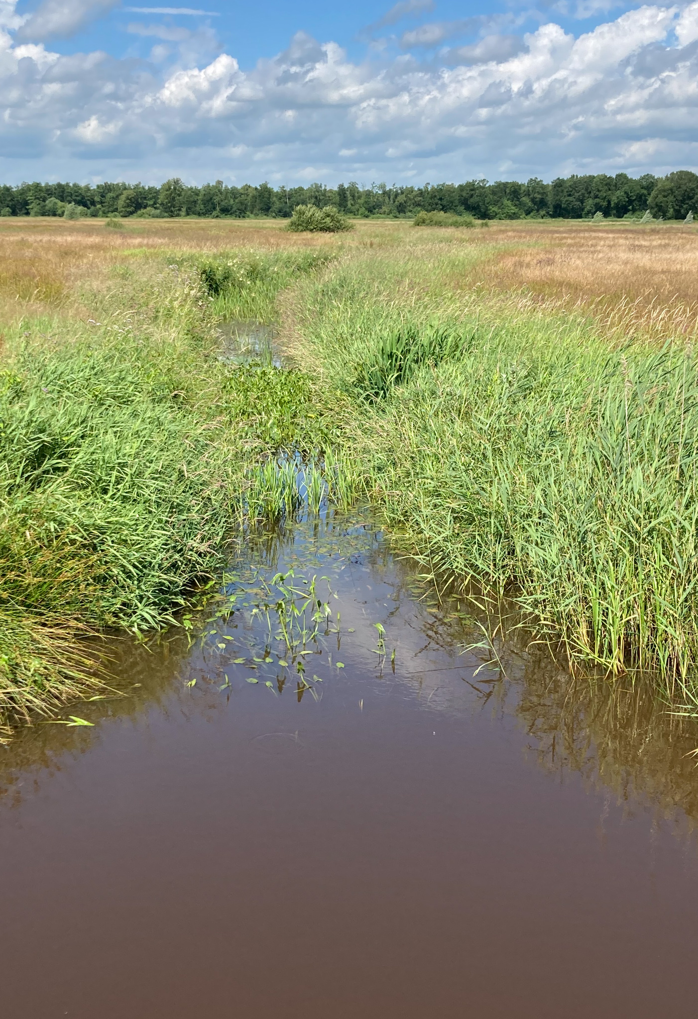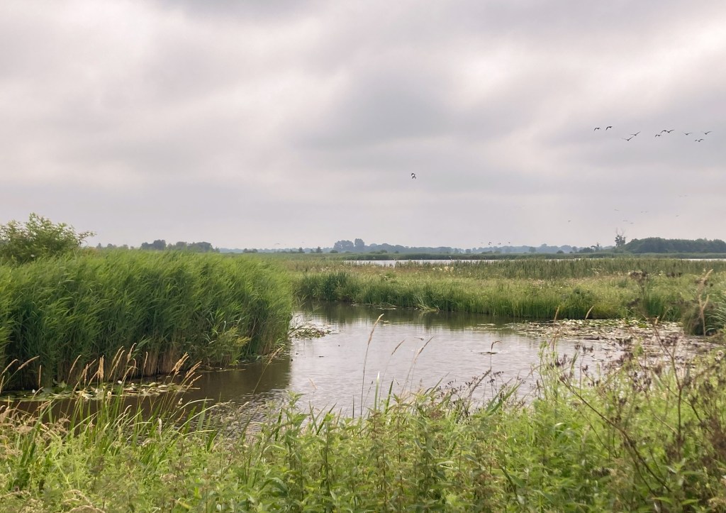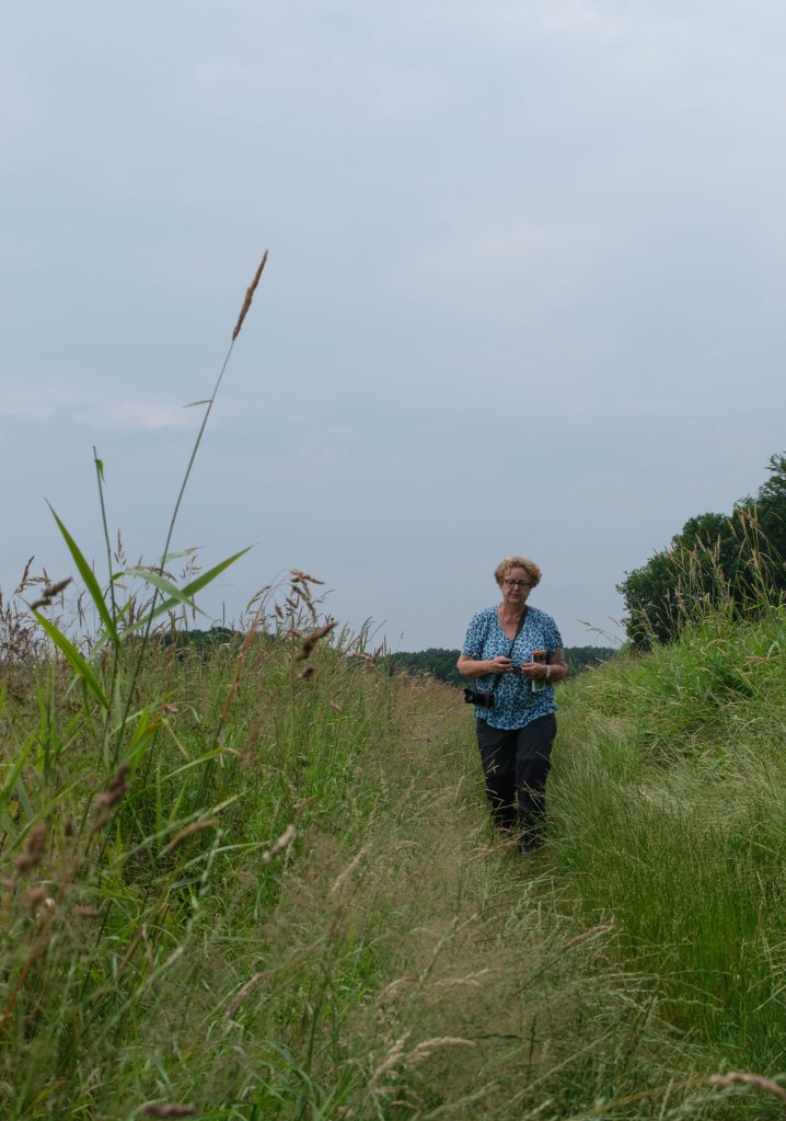 We hebben onze eerste stappen nog niet op het graspad langs het water gezet of de regen gaat over van een enkele drup naar een gestage miezer. We zien een een emmer aan een touw op de oever liggen met daarbij de vraag of de voorbijganger bij droogte de emmer wil vullen met water uit de sloot om de keileemplaatsen (kuilen in de grond) nat te houden. De huiszwaluwen in deze buurt hebben namelijk goede keileem nodig om hun nesten te bouwen. Gezien de plassen op ons pad is dit duidelijk niet nodig vandaag. Het geeft echter wel aan hoe er in dit gebied, we lopen nog steeds in De Onlanden, aandacht aan de natuur wordt geschonken. Ondertussen doet de regen er nog een schepje bovenop en voelt het inmiddels meer alsof we onder een grote douche staan.