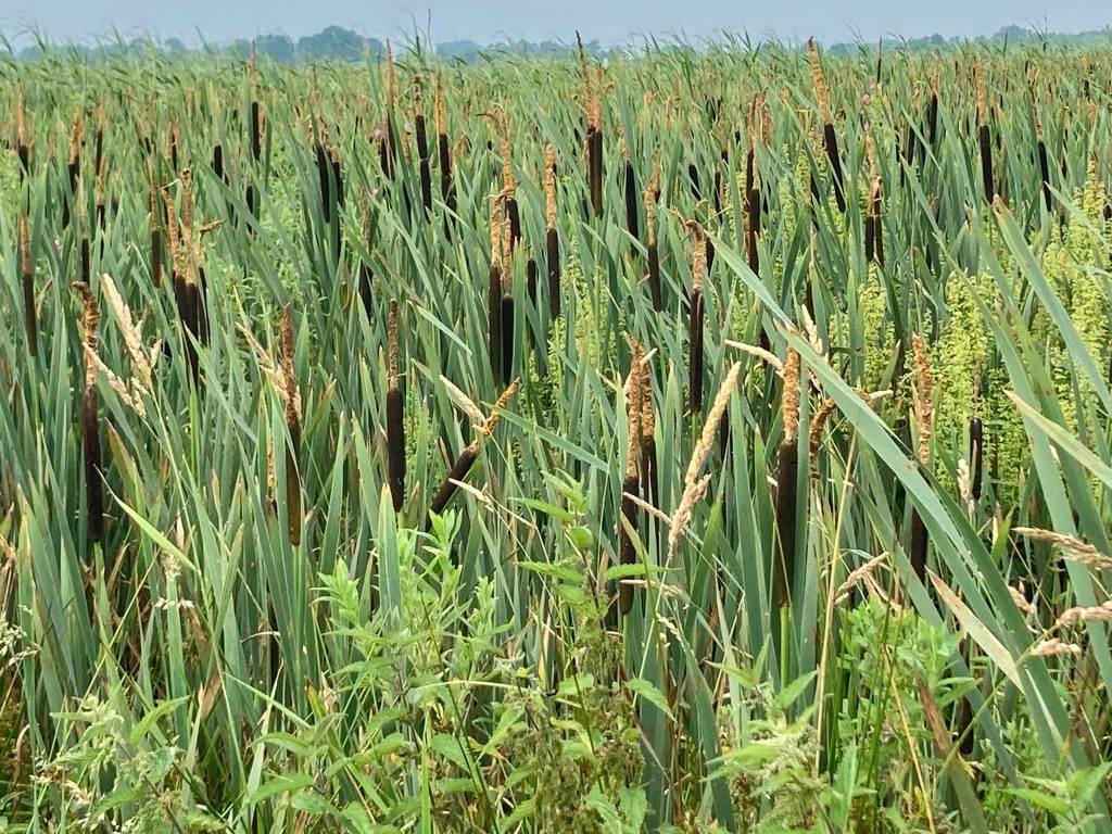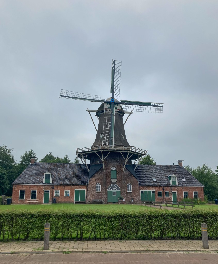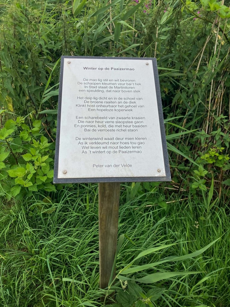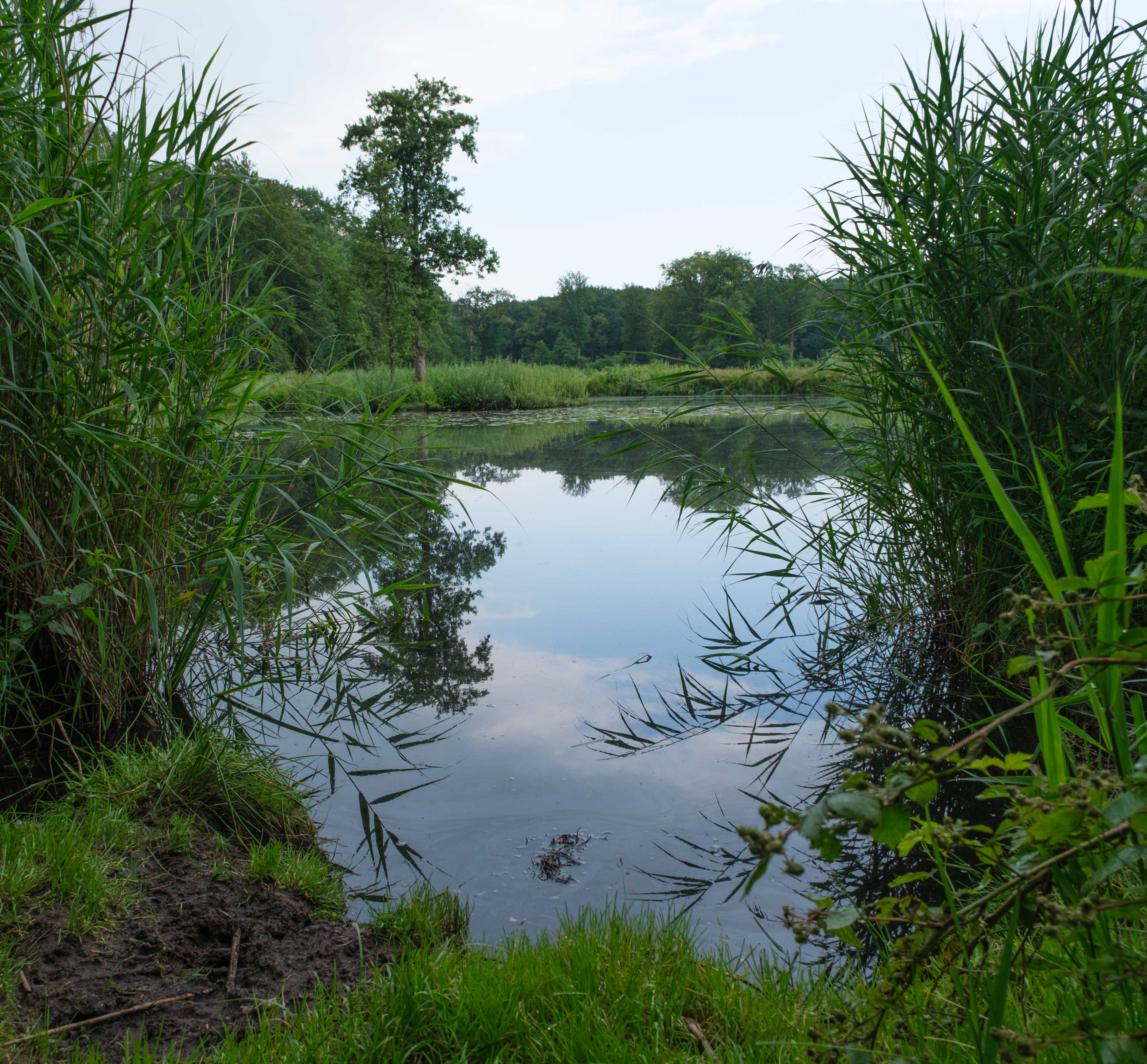 We hebben onze eerste stappen nog niet op het graspad langs het water gezet of de regen gaat over van een enkele drup naar een gestage miezer. We zien een een emmer aan een touw op de oever liggen met daarbij de vraag of de voorbijganger bij droogte de emmer wil vullen met water uit de sloot om de keileemplaatsen (kuilen in de grond) nat te houden. De huiszwaluwen in deze buurt hebben namelijk goede keileem nodig om hun nesten te bouwen. Gezien de plassen op ons pad is dit duidelijk niet nodig vandaag. Het geeft echter wel aan hoe er in dit gebied, we lopen nog steeds in De Onlanden, aandacht aan de natuur wordt geschonken. Ondertussen doet de regen er nog een schepje bovenop en voelt het inmiddels meer alsof we onder een grote douche staan.