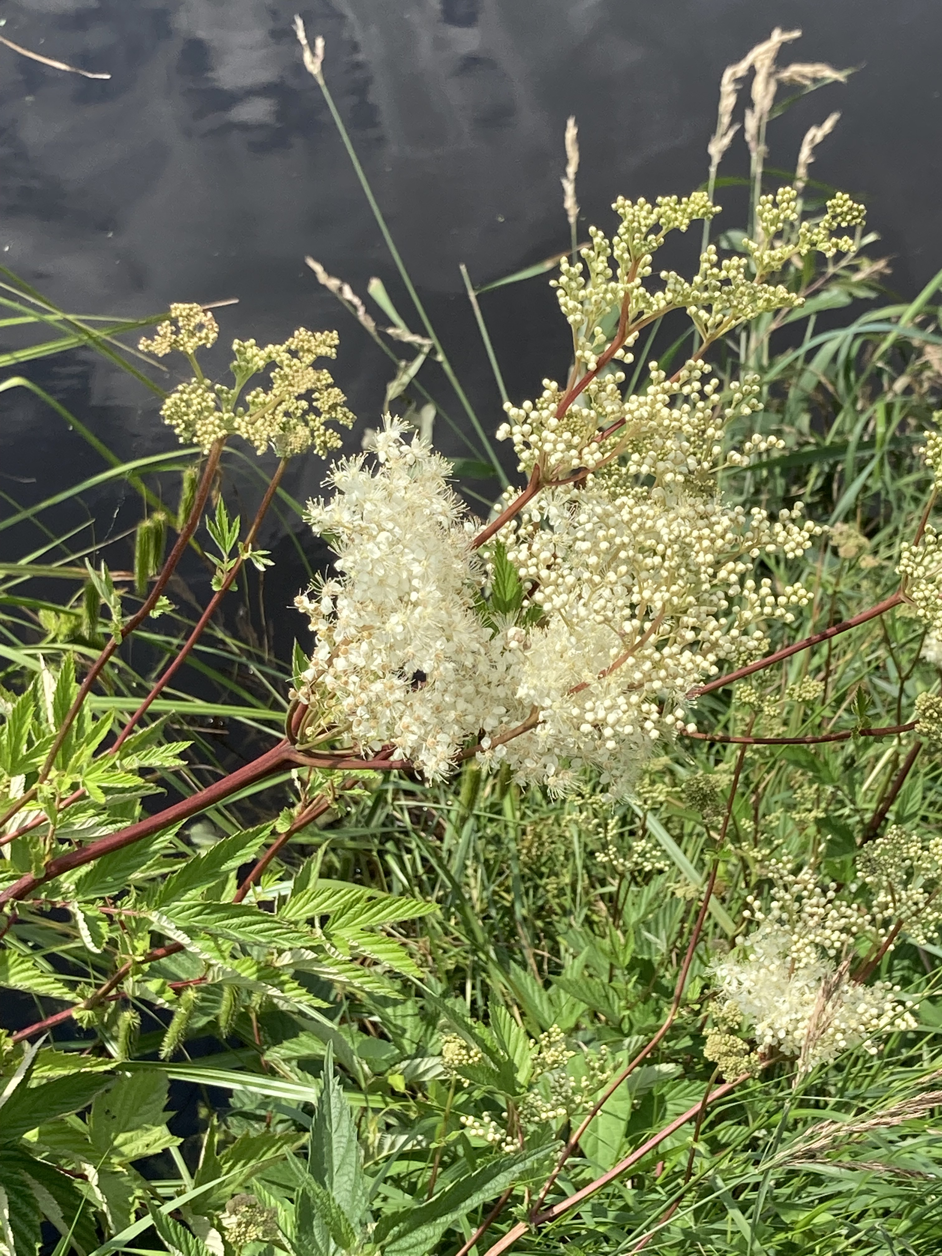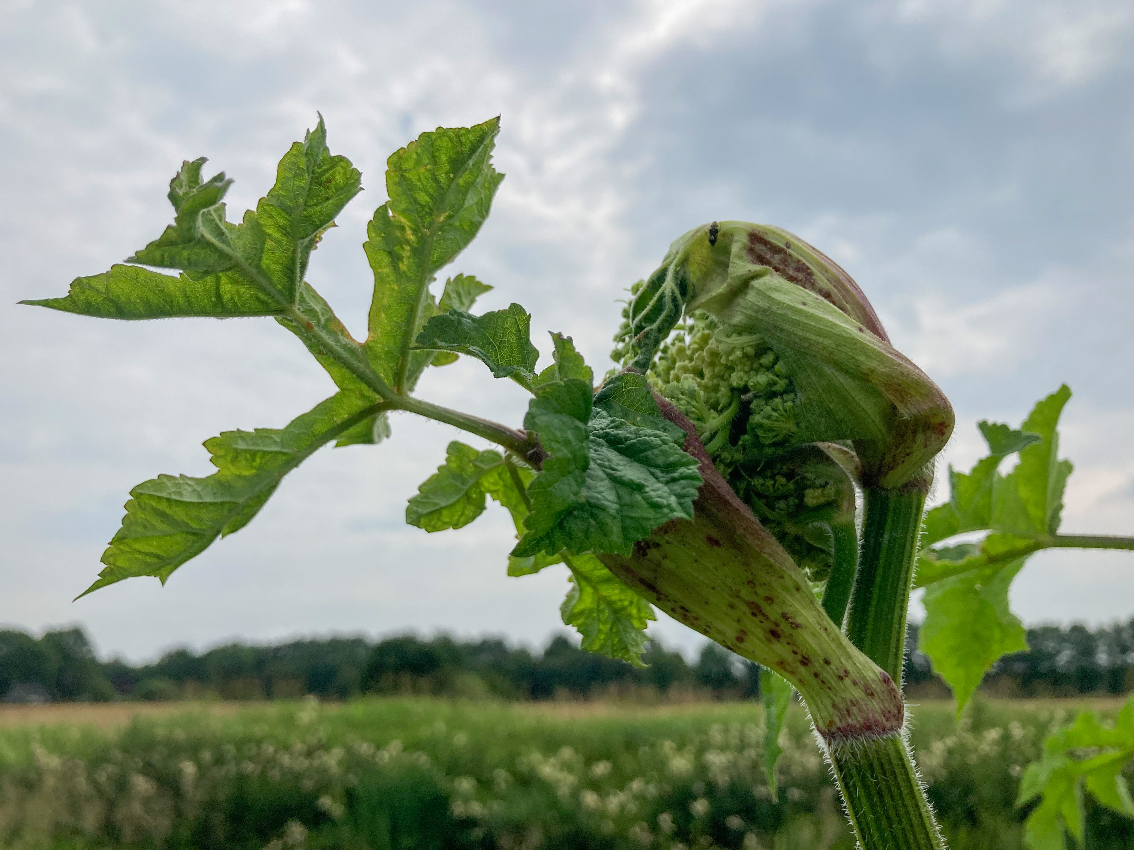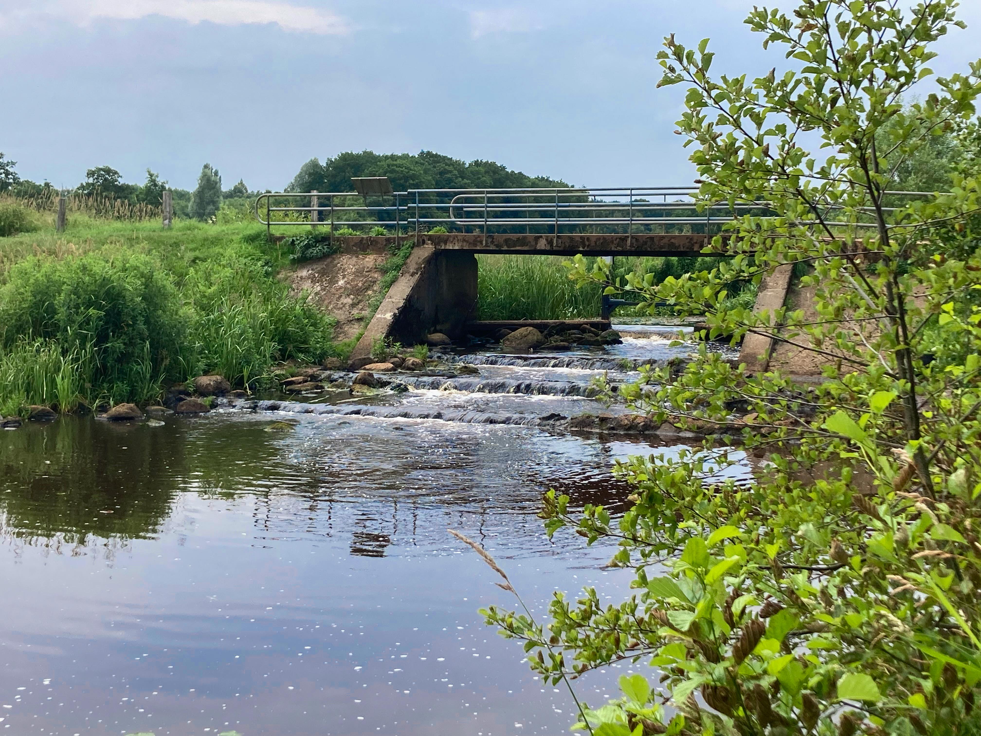 Ondertussen zijn we aangekomen op de dijk, verlaten we dit landgoed en slaan we rechtsaf over een smal bruggetje om onze weg over een halfverharde zandweg tussen twee weilanden te vervolgen. In de verte zien we de, ons bekende, Witte Molen. Het huidige rijksmonument ‘De Witte Molen’ werd in 1892 gebouwd. Bij deze molen stroomt de Drentsche Aa onder het Noord Willemskanaal door. Hiermee is de oude beekloop hersteld en komt het water via de oude Aa in het Friesche Veen. We steken de oude Aa over en zien vrijwilligers druk bezig met het verwijderen van exoten (in dit geval: uitheemse planten die zich hier hebben gevestigd maar hier oorspronkelijk niet vandaan komen). Zwaar werk.