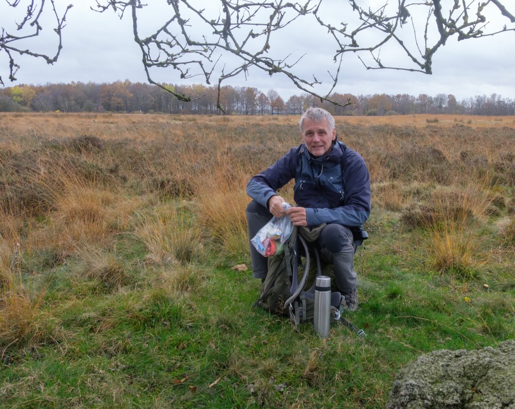 Dit heuvelachtige heidegebied is in het natte seizoen erg drassig en indien nodig kun je ook over het evenwijdig lopende fietspad verdergaan. Wij wagen de gok en lopen dwars door de heide verder over een smal ‘geitenpaadje’. Een paar dikke stenen onderweg zorgen voor een rustpunt waar we ons kunnen warmen aan een dampende kop koffie. De kleine geneugten van het onderweg zijn.