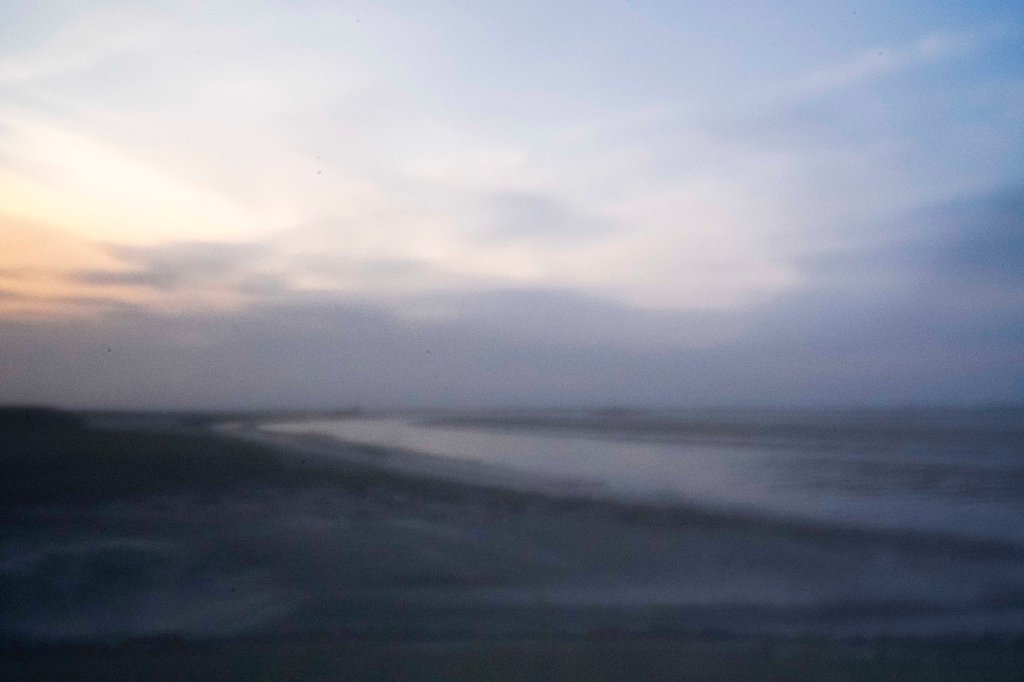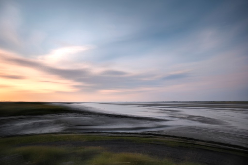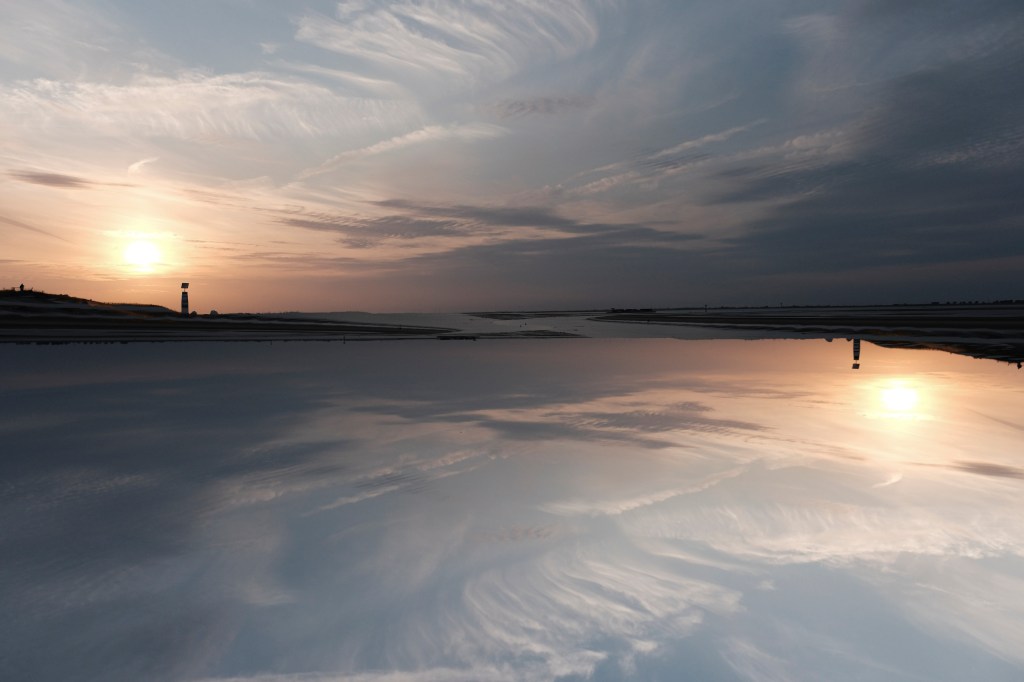 We kijken dus naar een bijzonder stukje natuur. Het licht is mooi en de ondergaande zon streelt met oranje en goud over de natte zand platen. We doen ons best waarbij vooral de dubbele belichting en de bewuste camera beweging (BCB) flink geoefend worden.