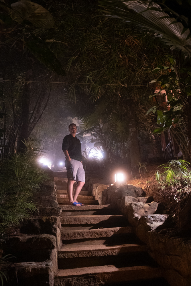 Het wordt vroeg donker en heel mistig. Onze telefoons laten zien dat we te maken hebben met een luchtvochtigheid van 98%. Dat roept herinneringen op aan Choladi waar lampen in de kledingkasten en een open haard in de woonkamer het vocht moesten verdrijven. Hier is het wel feeëriek met mistflarden om de lampjes langs de kant van de trap omhoog.