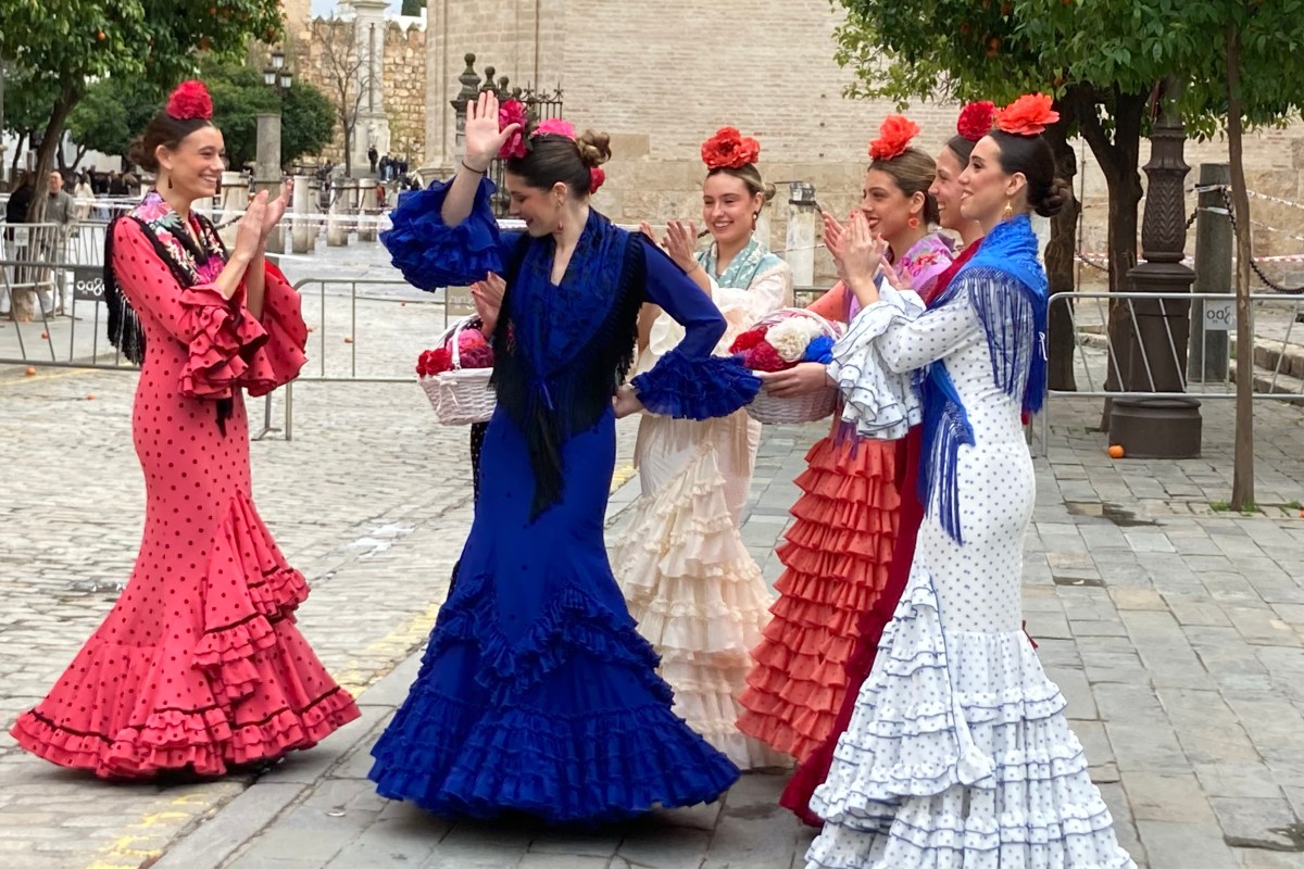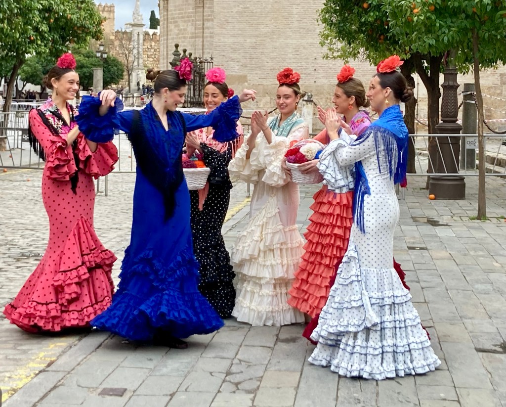 Terwijl we langs de kathedraal en de Giralda toren (ooit een minaret) lopen, zien we opeens een groepje vrouwen die met elkaar op de foto gaan in hun flamenco outfit. Iedereen om ons heen stopt en haalt zijn of haar telefoon tevoorschijn. De dames verblikken of verblozen niet door alle aandacht. Sterker nog, we worden getrakteerd op een spontane gracieuze demonstratie van enkele dames. Het wordt opeens erg dringen geblazen om de groep goed te fotograferen, hahaha.
