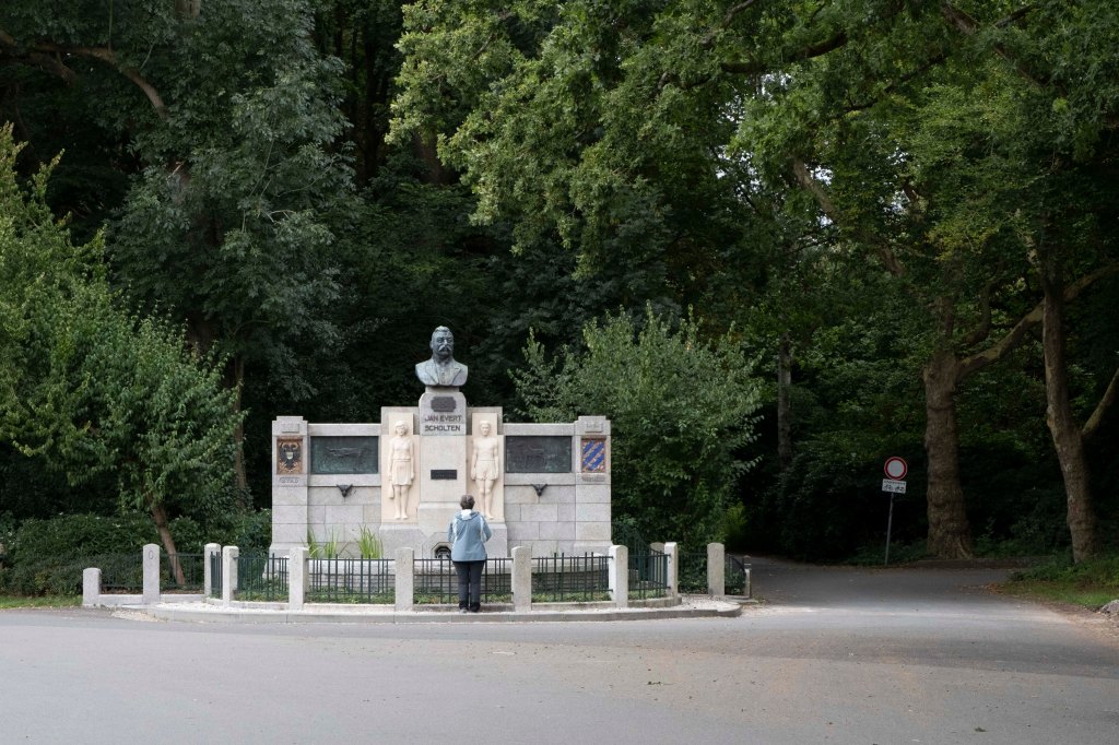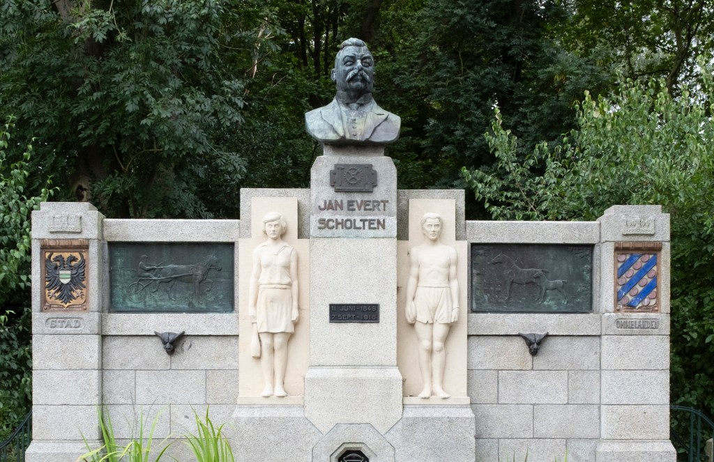 Als eerbetoon is er in 1931 een monument voor Scholten geplaatst aan de Concourslaan, een prominente plek in het park. Boven op een kalkstenen muur staat een bronzen buste van Jan Evert Scholten die met een trotse het Stadspark inkijkt. Uit de muur waarop de sculptuur staat, zijn twee kinderfiguren in sportkleding gehouwen: een meisje met knotsen en een jongen met een discus. De bronzen plaquettes ernaast tonen een paard met een veulen en een paard met kar en wagen. Deze verwijzen naar de paardenfokkerij en de drafsport, twee liefhebberijen van Scholten. Op de hoeken van het monument zijn de wapens van Stad en Ommelanden aangegeven.