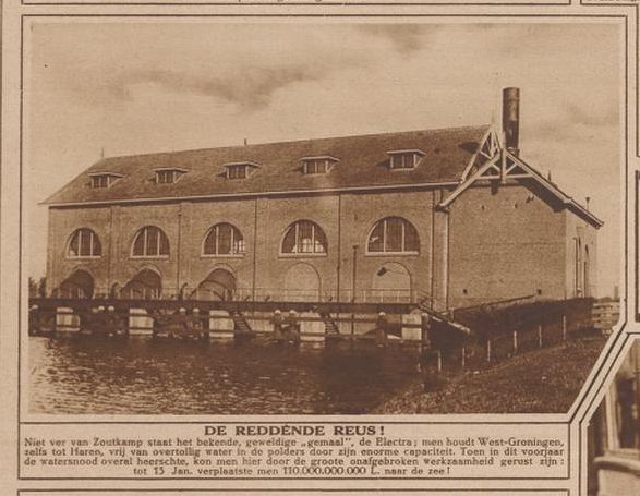We lopen verder richting het volgende ‘pareltje’ in de vorm van een groot gemaal. Meer dan een eeuw geleden vormde de afvoer van regenwater vaak een groot probleem, waardoor er, vlakbij Lammerburen, een groot gemaal werd gebouwd dat in 1920 officieel in gebruik werd genomen door koningin Wilhelmina. De bouwkosten bedroegen 3,5 miljoen gulden. Het gemaal kreeg de naam Waterwolf en het waterschap dat het gemaal beheerde, kreeg de naam Electra. Twee bijzondere namen voor een voor die tijd uniek waterstaatkundig bouwwerk.